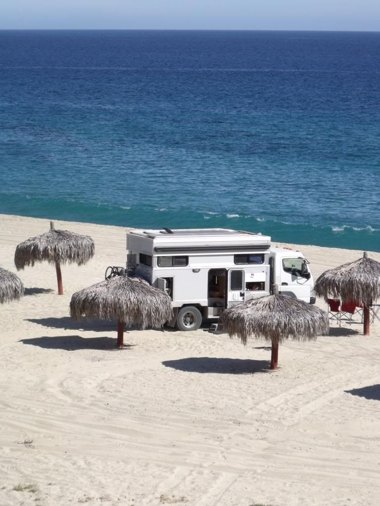 We found ourselves a small odd RV campground close to downtown where Les and the owner did some Kareoke duettes, here we took the bikes off and rode into town,where we visited Cabo Wabo, and the Giggling Marlin where Les was strung up, and also to the other side of town and bullshitted our way through a hotel and managed to walk along the beach, up some rocks to the famous lovers beach...........saved ourselves $50!!
